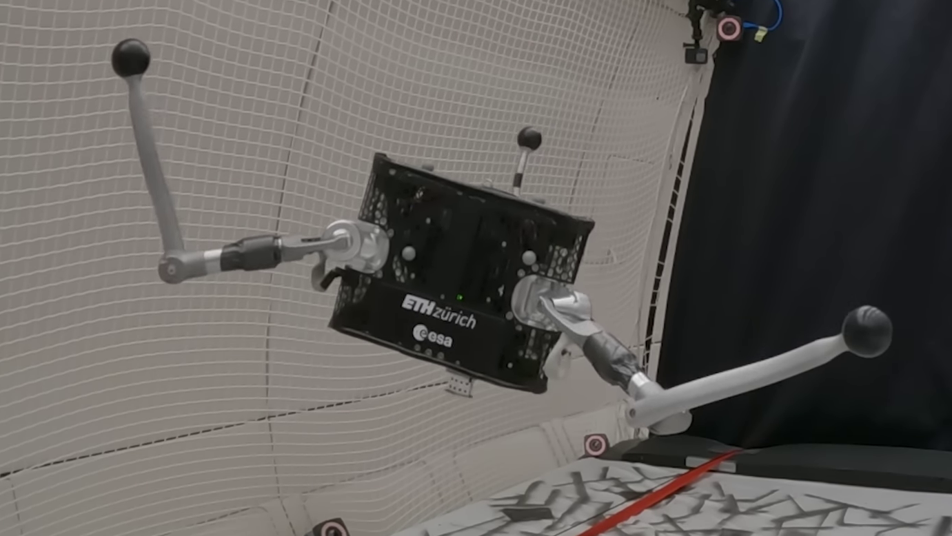 SpaceHopper is a small-scale three-legged hopping robot developed by students at ETH Zurich for future exploration of low-gravity environments like asteroids or small moons. It is designed to perform jumping locomotion with extended flight phases, using its legs for mid-air body reorientation.
